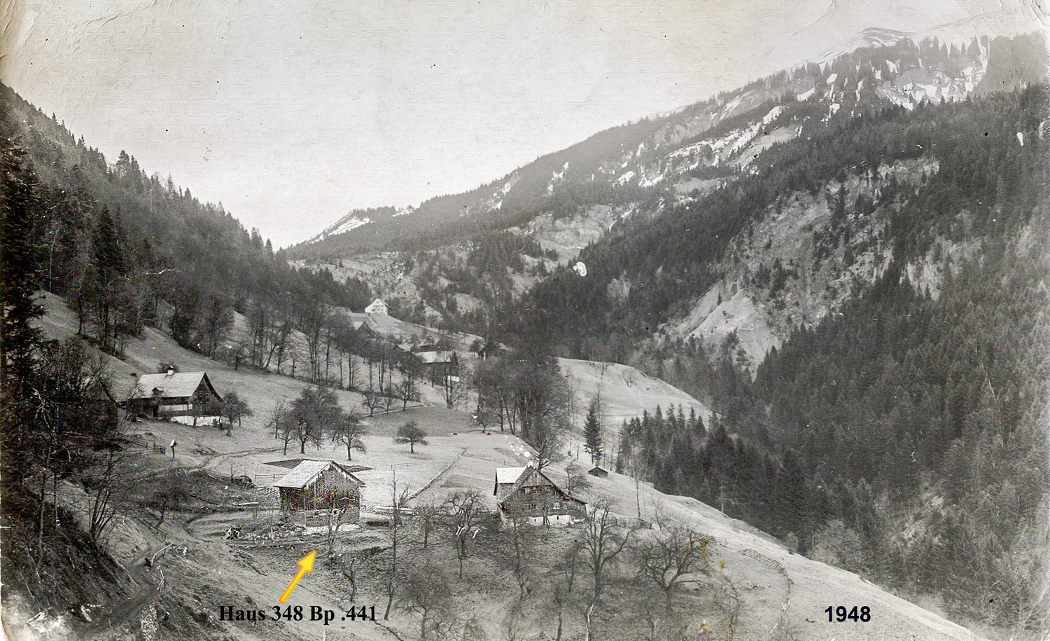 Foto oben © von Josefine Fenkart geb. Vogel aus dem Jahr 1948: vorne links, das Wohnhaus auf der Bauparzelle .441 ist bereits zum Stall umfunktioniert worden.