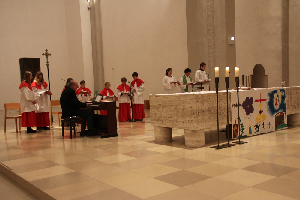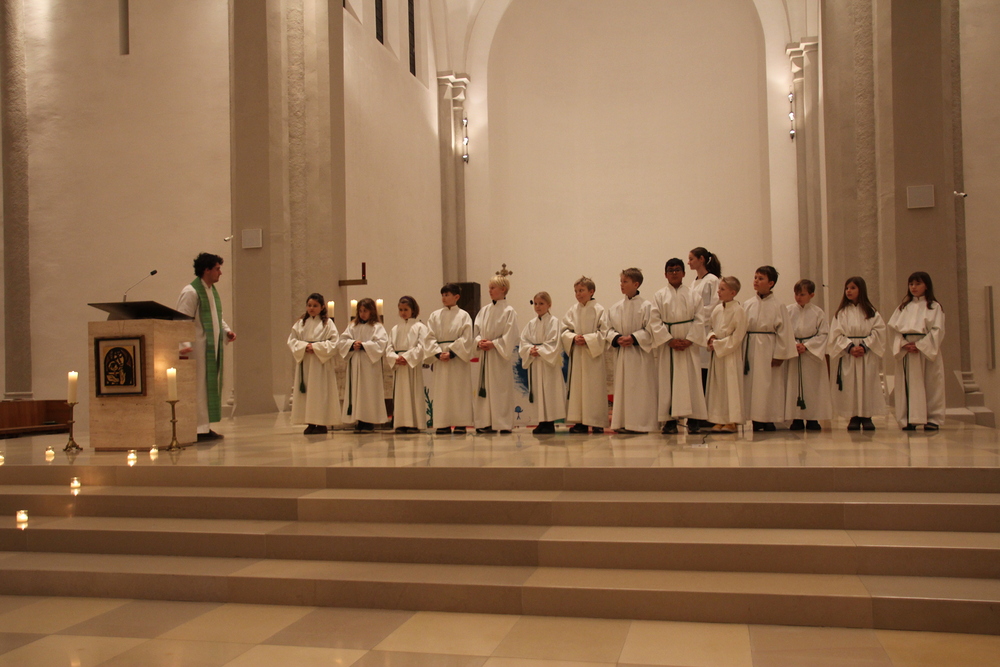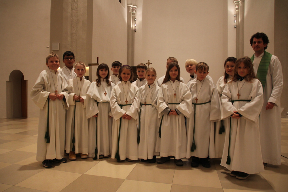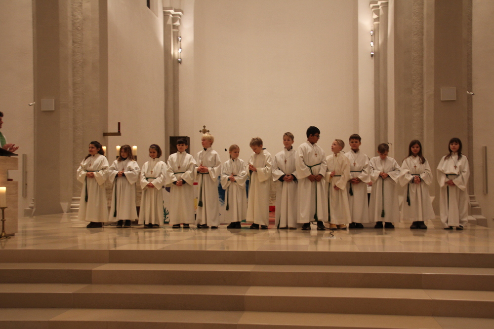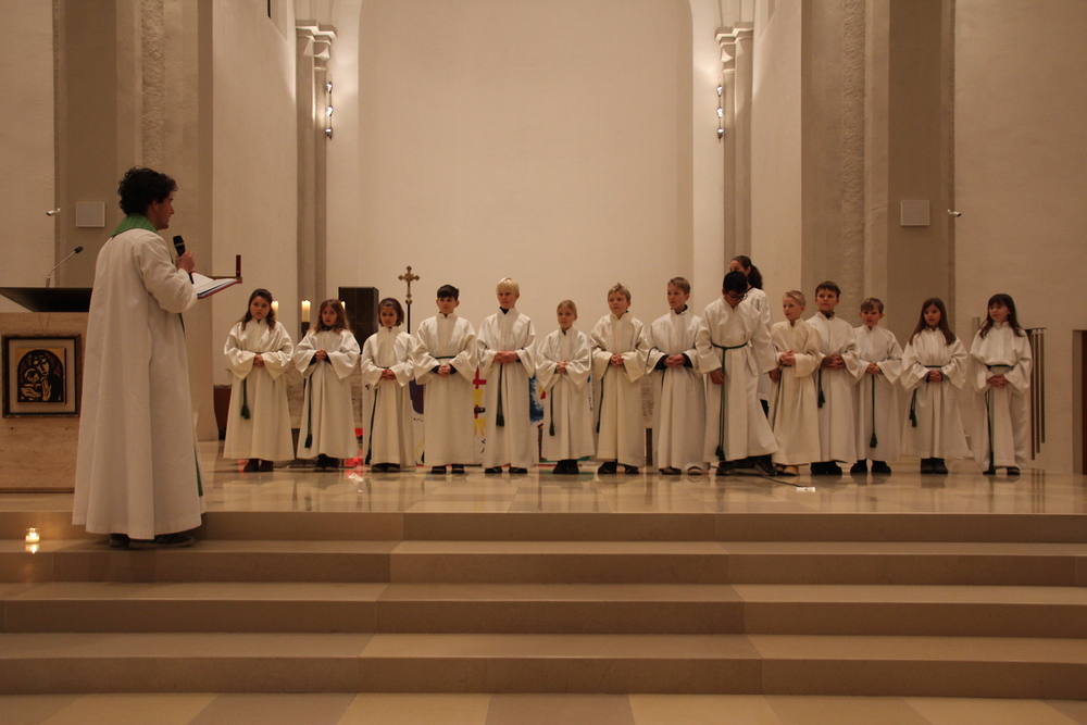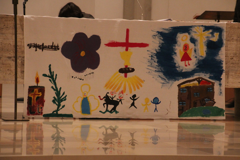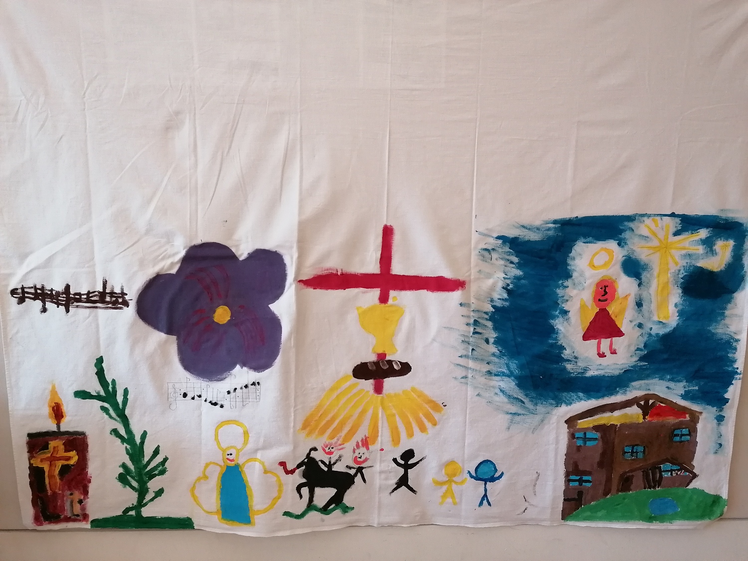 In der Mitte befindet sich die Eucharistie und die Gemeinschaft in Familie und Bekanntschaften. Ebenso sind die Musik und die Natur Orte, an denen sie religiöse Erfahrungen sammeln. Weihnachten nimmt auf dem Tuch den größten Platz ein: Hier machen wohl alle eine Erfahrung von „Himmel“. So fließen die eigenen, wertvollen Glaubenserfahrungen in die Gruppe mit ein und bereichern diese. Das Ministrieren wird dadurch nicht nur zum schalen Dienst, sondern spiegelt das eigene Leben wieder.