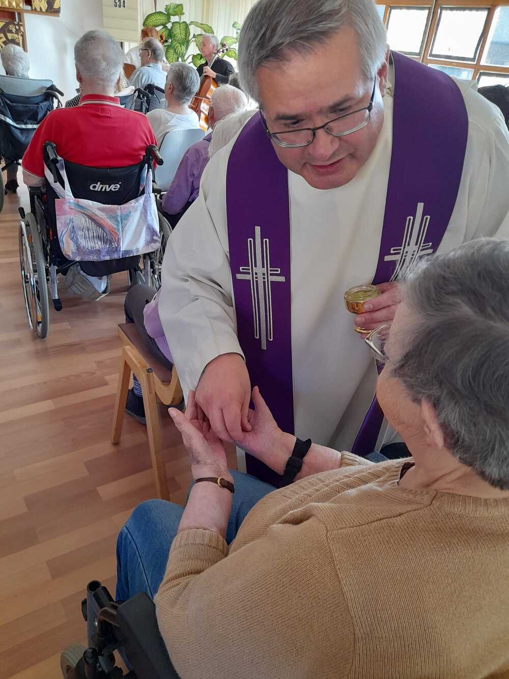 Am Samstag, 22. März 2025 feierten wir in der voll besetzten Herz Maria Kapelle im Haus der Generationen das Fest der Krankensalbung. Zusammen mit BewohnerInnen und Gästen aus der Pfarre spendeten Pfr. Rainer Büchel und Pfr. Rome Pal im Rahmen der Eucharistie dieses Sakrament. Dabei sprachen sie den betroffenen Menschen Hoffnung, Zuversicht und Lebenskraft zu. So wurde einmal mehr erfahrbar, dass Gott uns gerade in schweren Zeiten stärken und aufrichten möchte. In diesem Sinne konnten wir miteinander ein Fest des Lebens feiern.