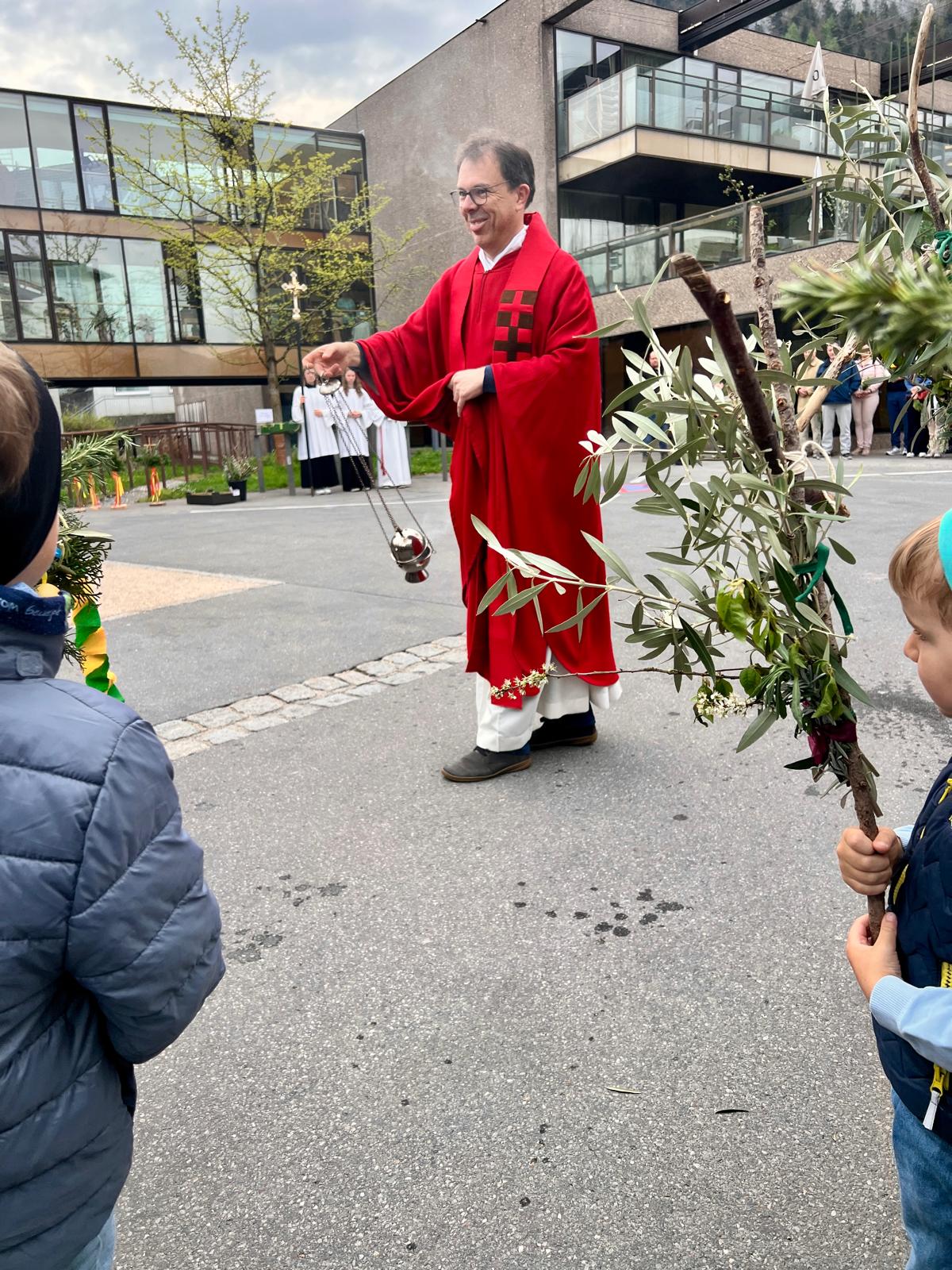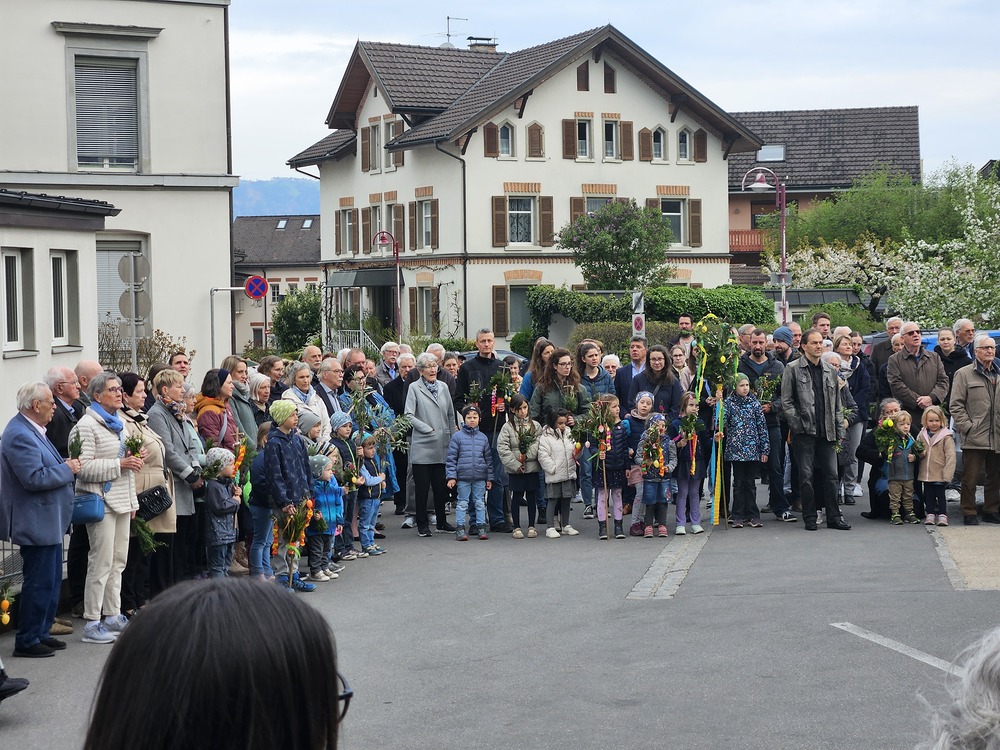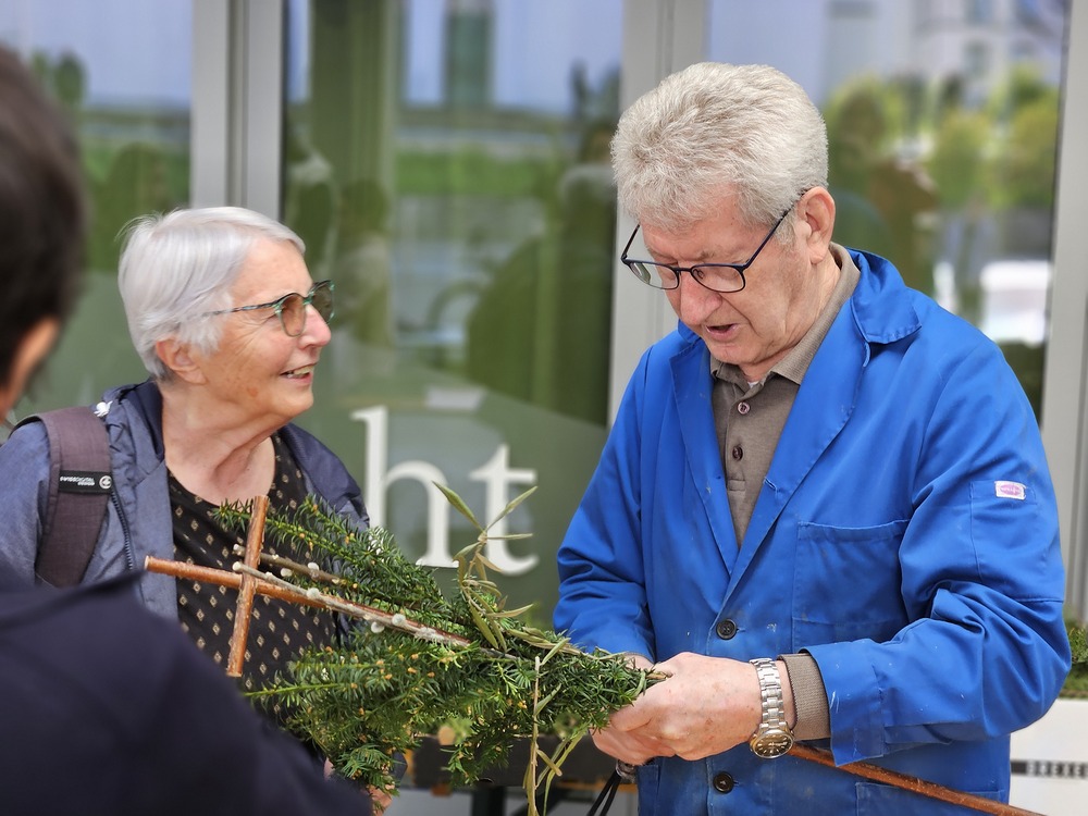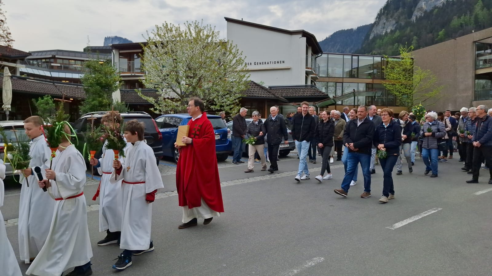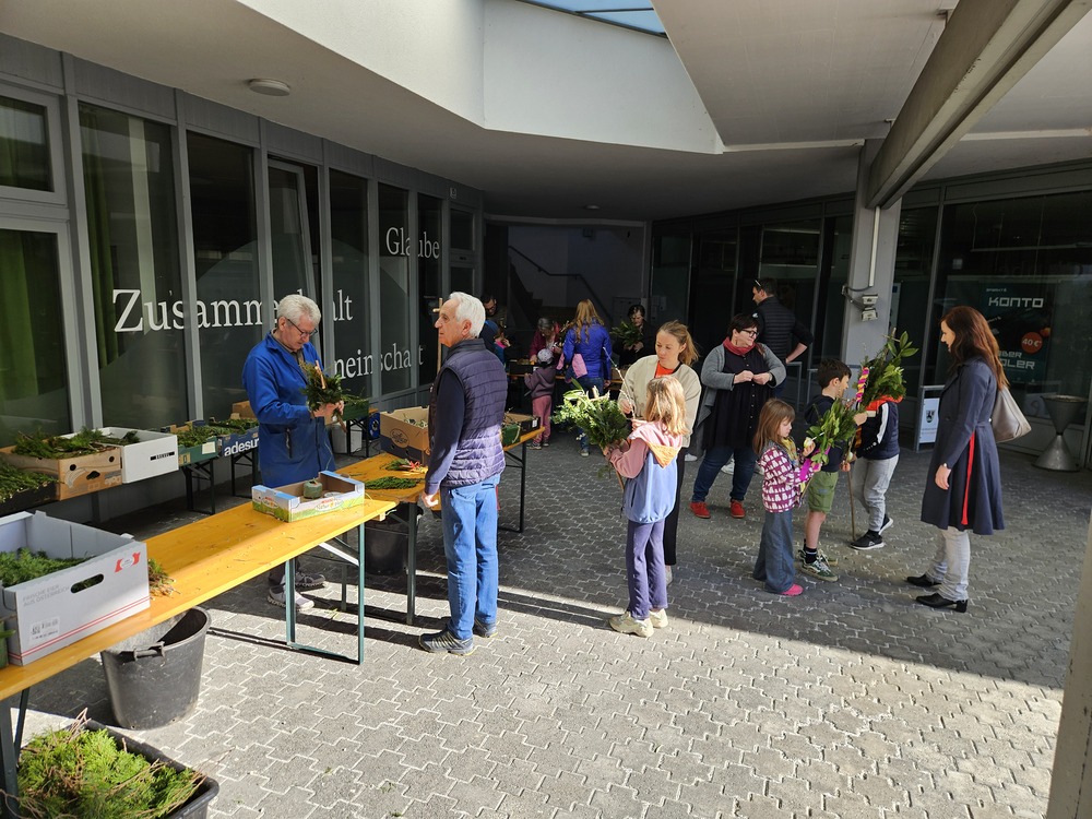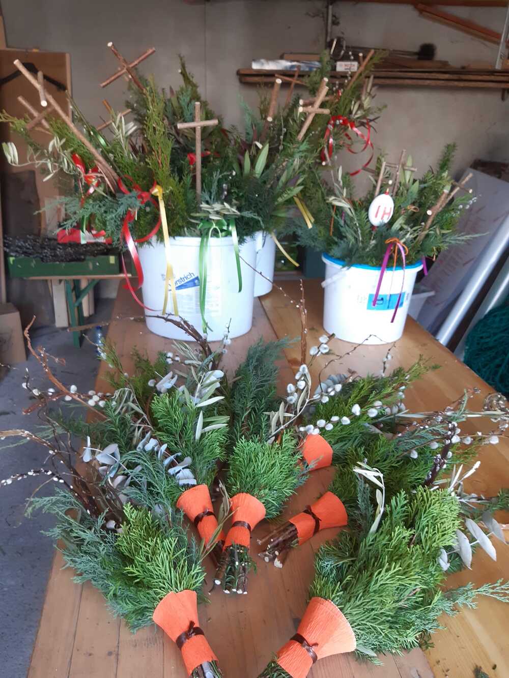 Die Tradition der Palmbuschen wird durch die Arbeit der Helfer und Helferinnen um Norbert Loacker hochgehalten. Ihr Einsatz macht es möglich, dass wir am Palmsonntag sinnlich zusammenkommen können. Die gesegneten Buschen, Zeichen und Erinnerung an Jesus, werden zu Hause in den Wohnungen aufgestellt und in vielen Gemeinden werden die Palmbuschen, die in der Kirche bleiben, zu Asche verbrannt und am Aschermittwoch im kommenden Jahr wird diese Asche verwendet, den Menschen das Aschekreuz auf die Stirn zu zeichnen.