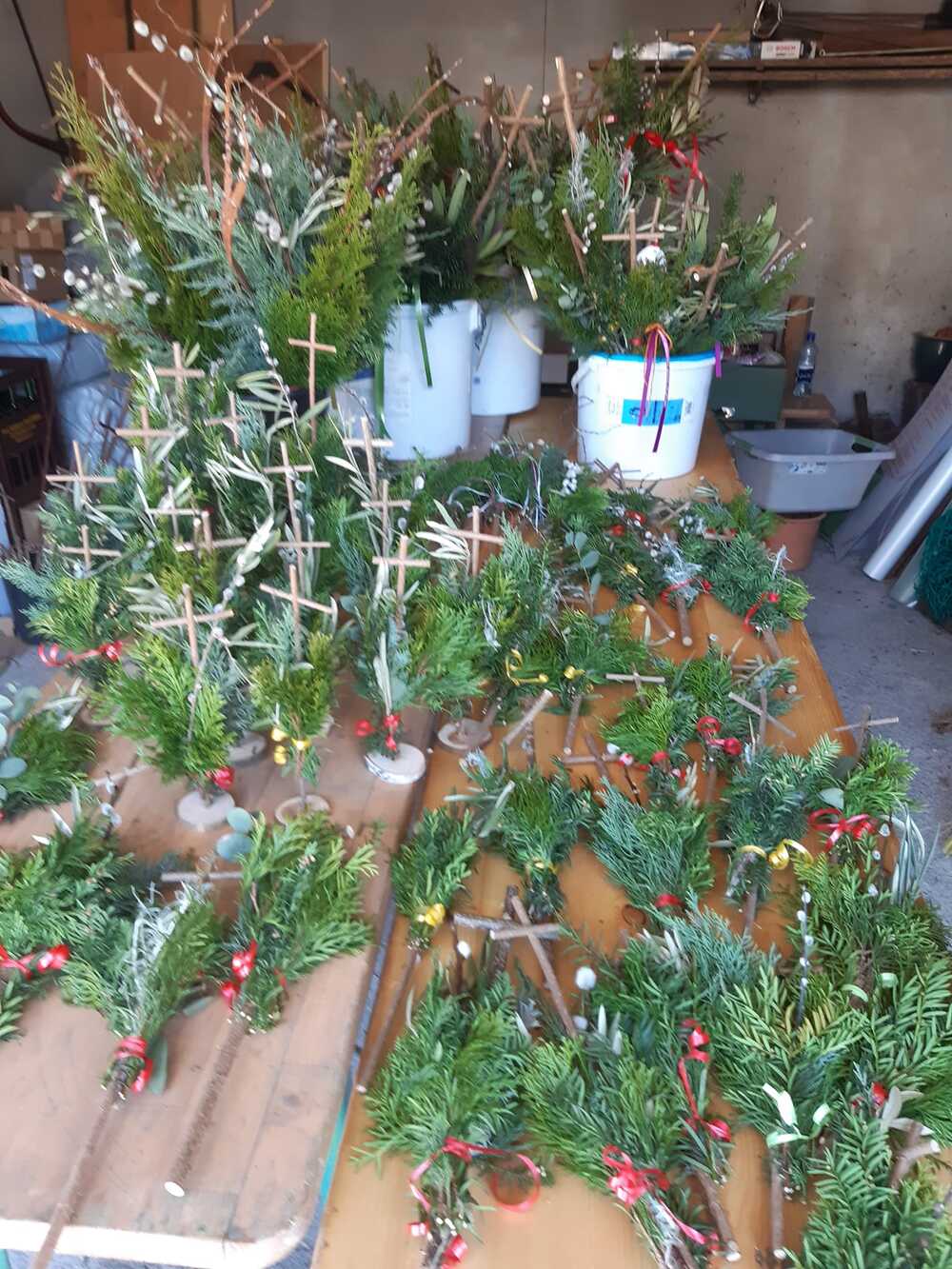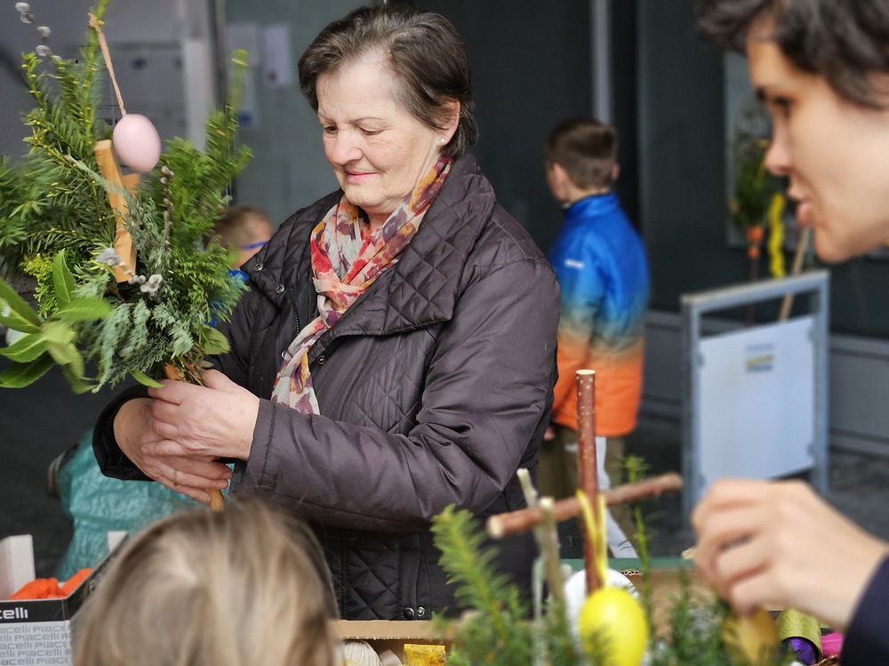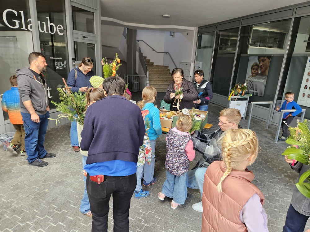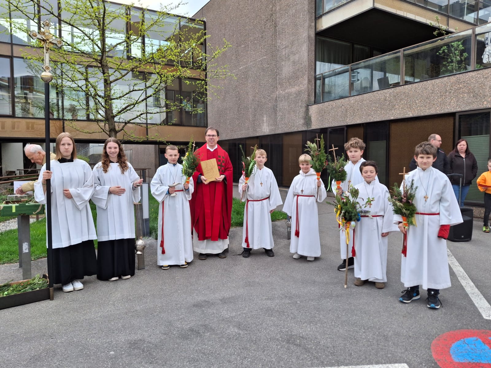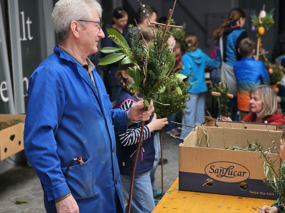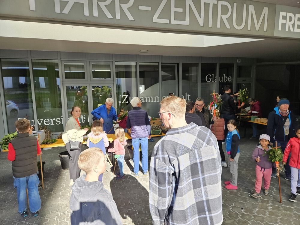 Die Tradition der Palmbuschen wird durch die Arbeit der Helfer und Helferinnen um Norbert Loacker hochgehalten. Ihr Einsatz macht es möglich, dass wir am Palmsonntag sinnlich zusammenkommen können. Die gesegneten Buschen, Zeichen und Erinnerung an Jesus, werden zu Hause in den Wohnungen aufgestellt und in vielen Gemeinden werden die Palmbuschen, die in der Kirche bleiben, zu Asche verbrannt und am Aschermittwoch im kommenden Jahr wird diese Asche verwendet, den Menschen das Aschekreuz auf die Stirn zu zeichnen.
