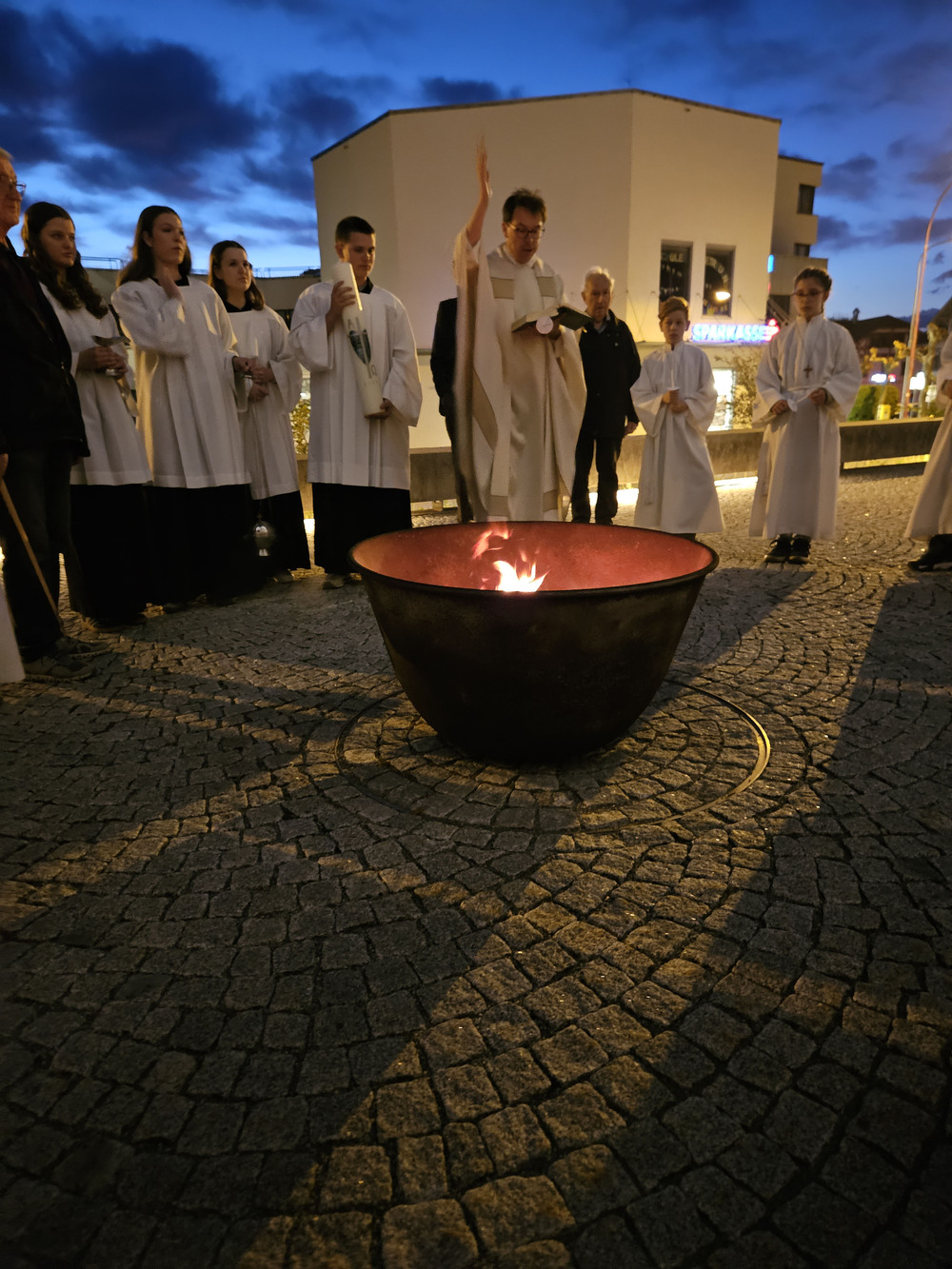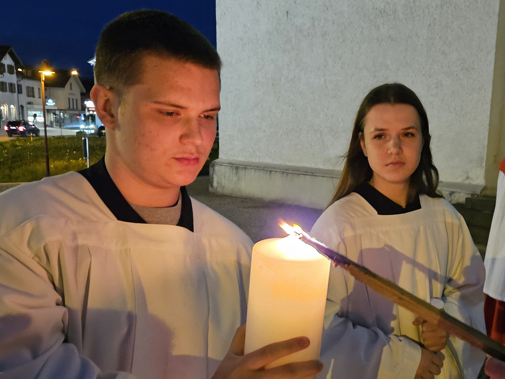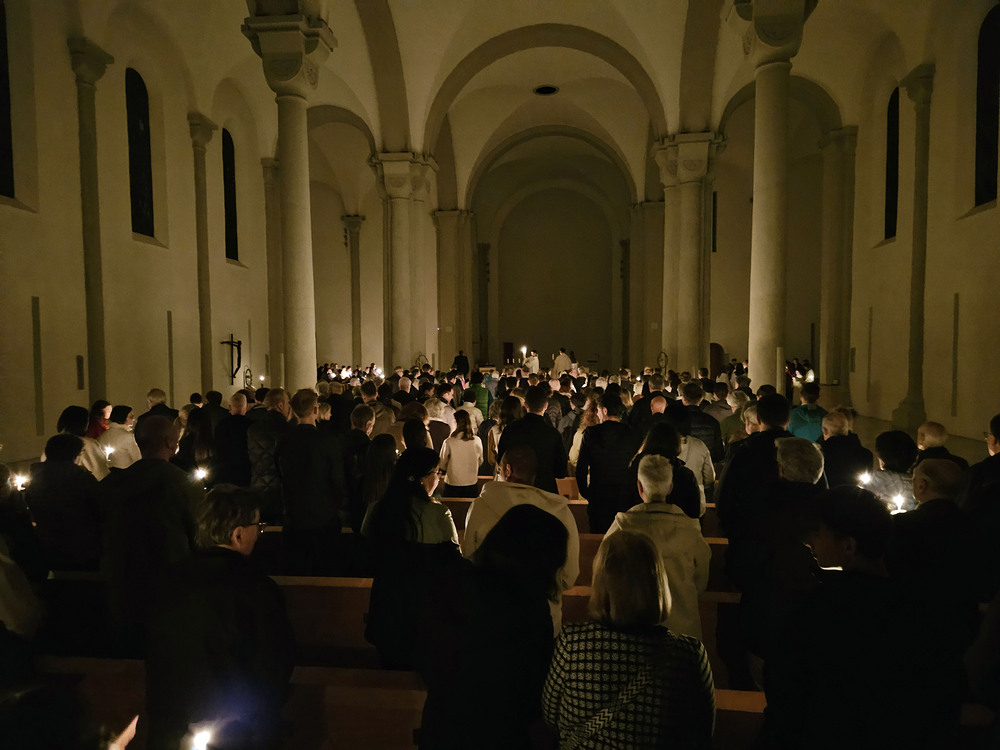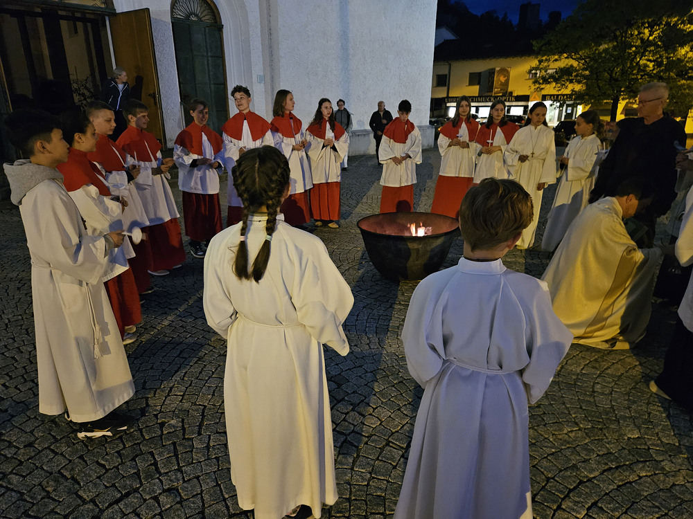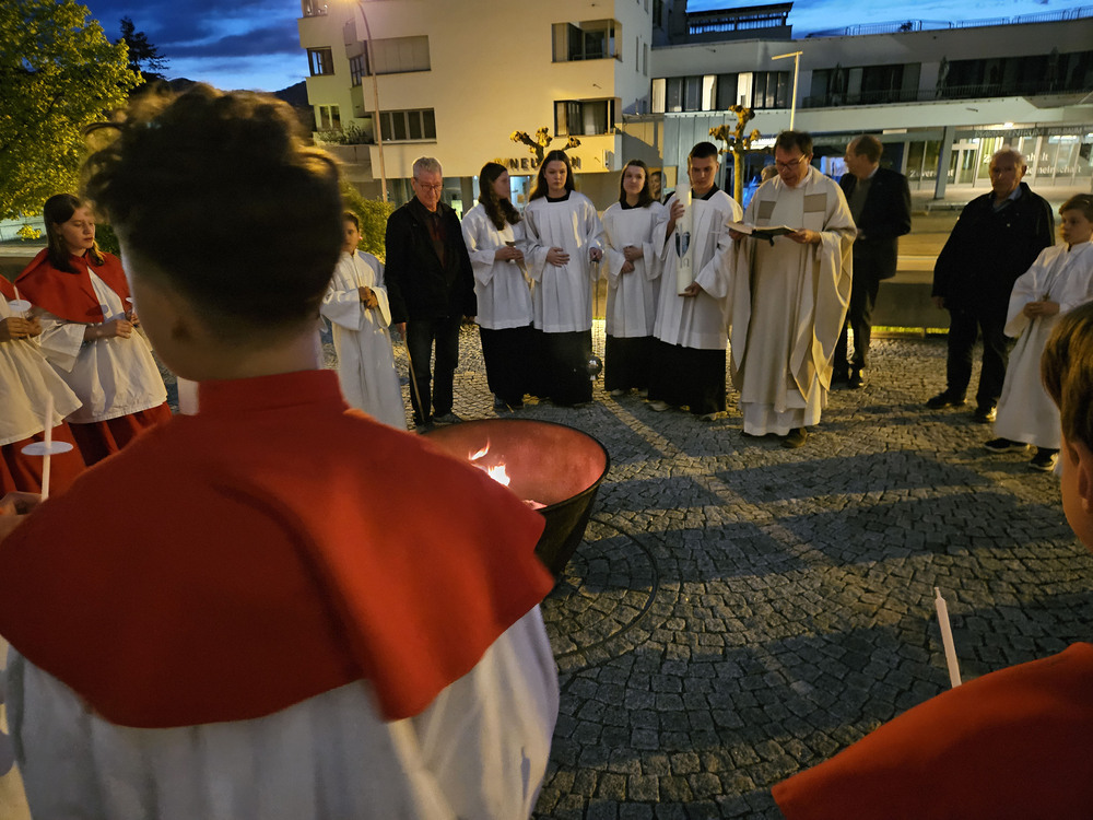 Die Feier der Osternacht beginnt mit der Lichtfeier. Das Feuer wird gesegnet und die Osterkerze angezündet.