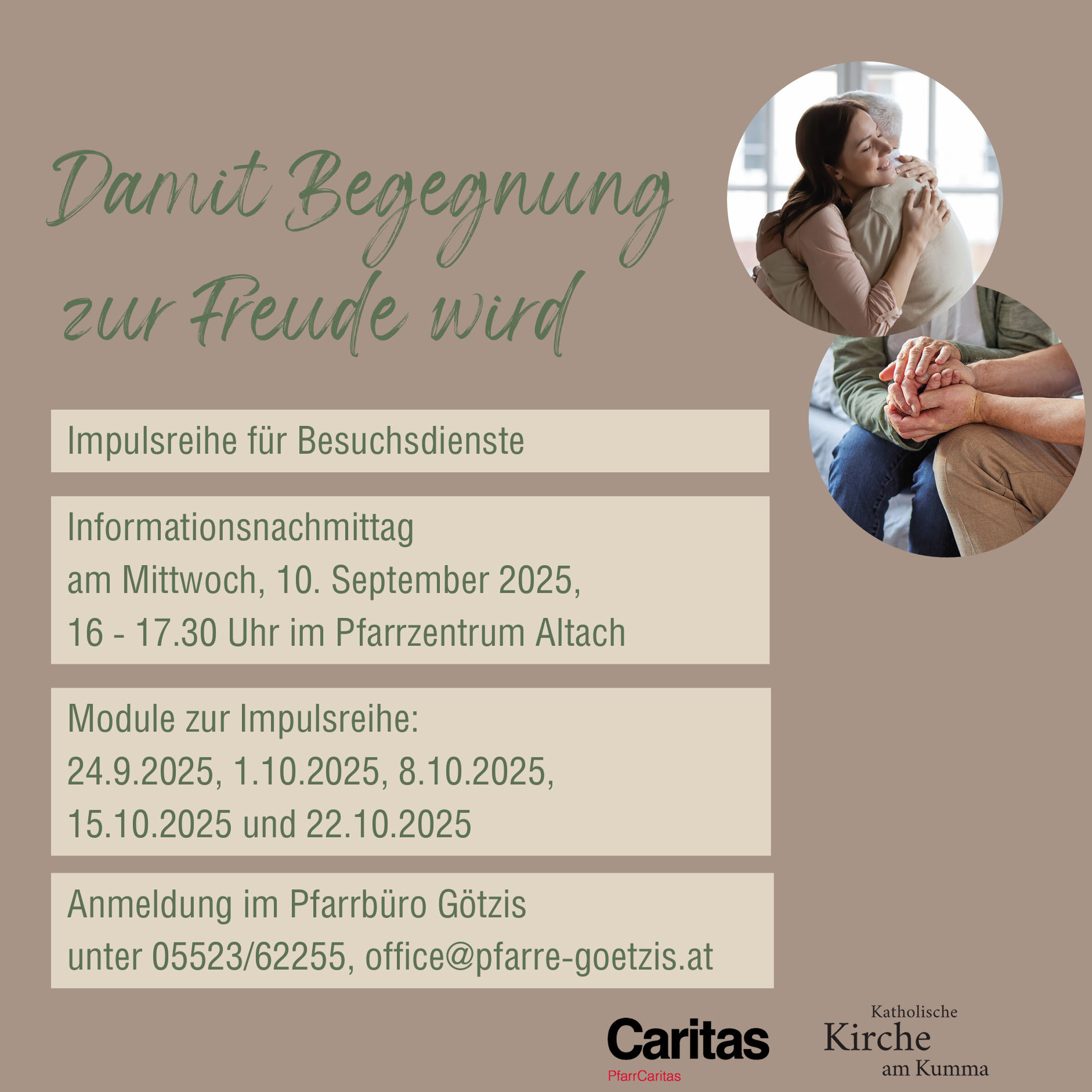 In der Seelsorge für Menschen im Alter suchen wir neue Mitarbeiter*innen, die ehrenamtlich ihre Zeit für Besuche Zuhause oder im Pflegeheim zur Verfügung stellen möchten. Unter dem Motto „Damit Begegnung zur Freude wird“ organisieren die PfarrCaritas und der Pfarrverband Katholische Kirche am Kumma gemeinsam Impulse und Anregungen, um für Besuchsdienste das Interesse zur Mitarbeit zu wecken.