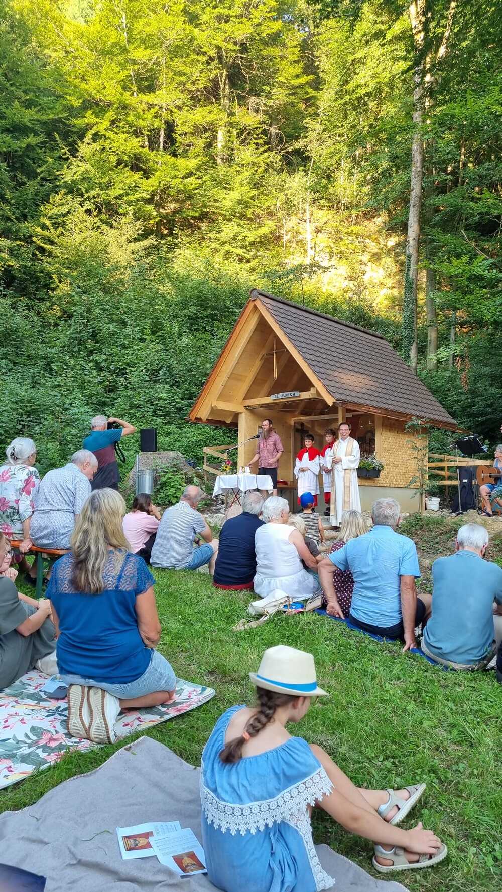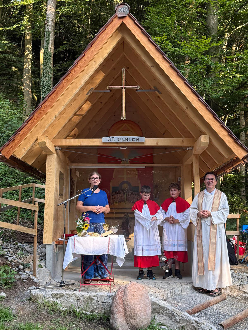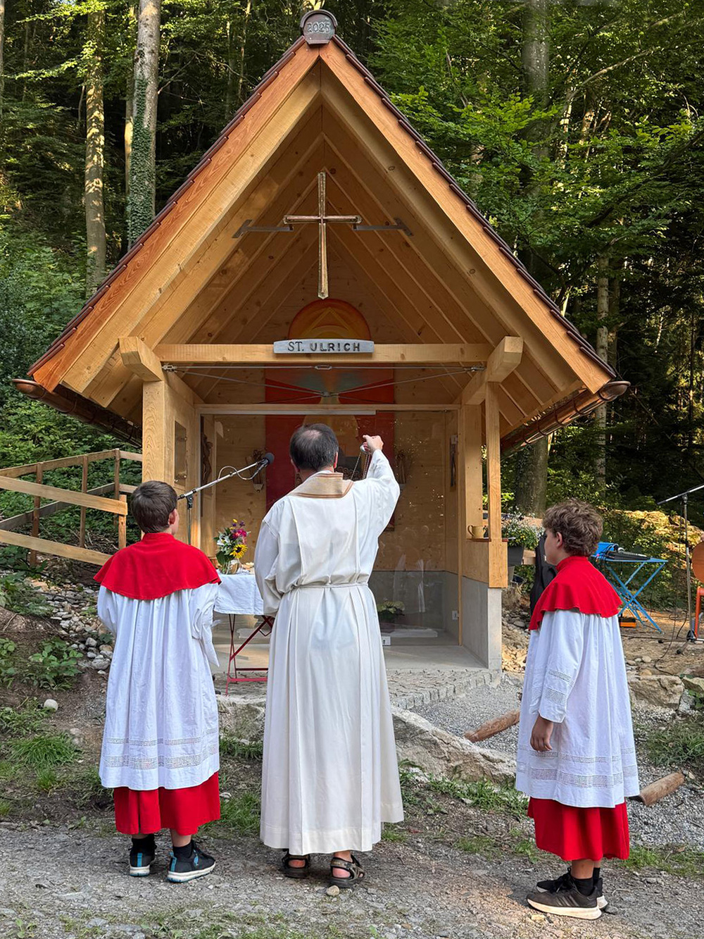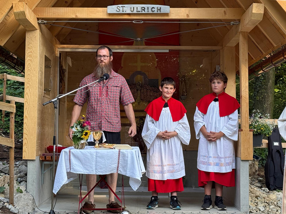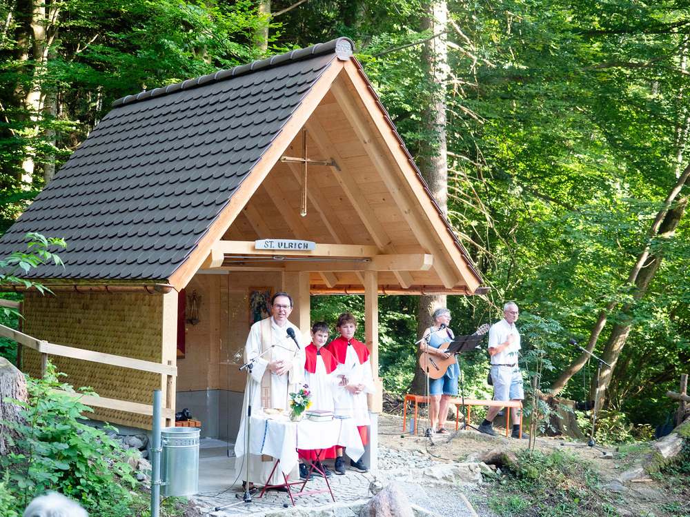 Im Rahmen eines stimmungsvollen Gottesdienstes, am 9. August 2025, weihte Pfr. Rainer Büchel die Ulrichskapelle ein, verbunden mit dem Dank an alle, die ohne langes Reden einfach gehandelt und diese Kapelle errichtet haben. Die Ulrichskapelle wurde gesegnet, damit sie allen zum Segen werde, die hier vorbeikommen.