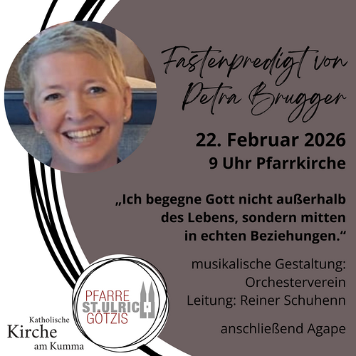 22.02.2026, 09:00 Uhr Messfeier mit Fastenpredigt von Petra Brugger | "Ich begegne Gott nicht außerhalb des Lebens, sondern mitten in echten Beziehungen."| musik. Gestaltung: Orchesterverein, anschließend Agape Pfarrkirche St. Ulrich Götzis Mehr lesen