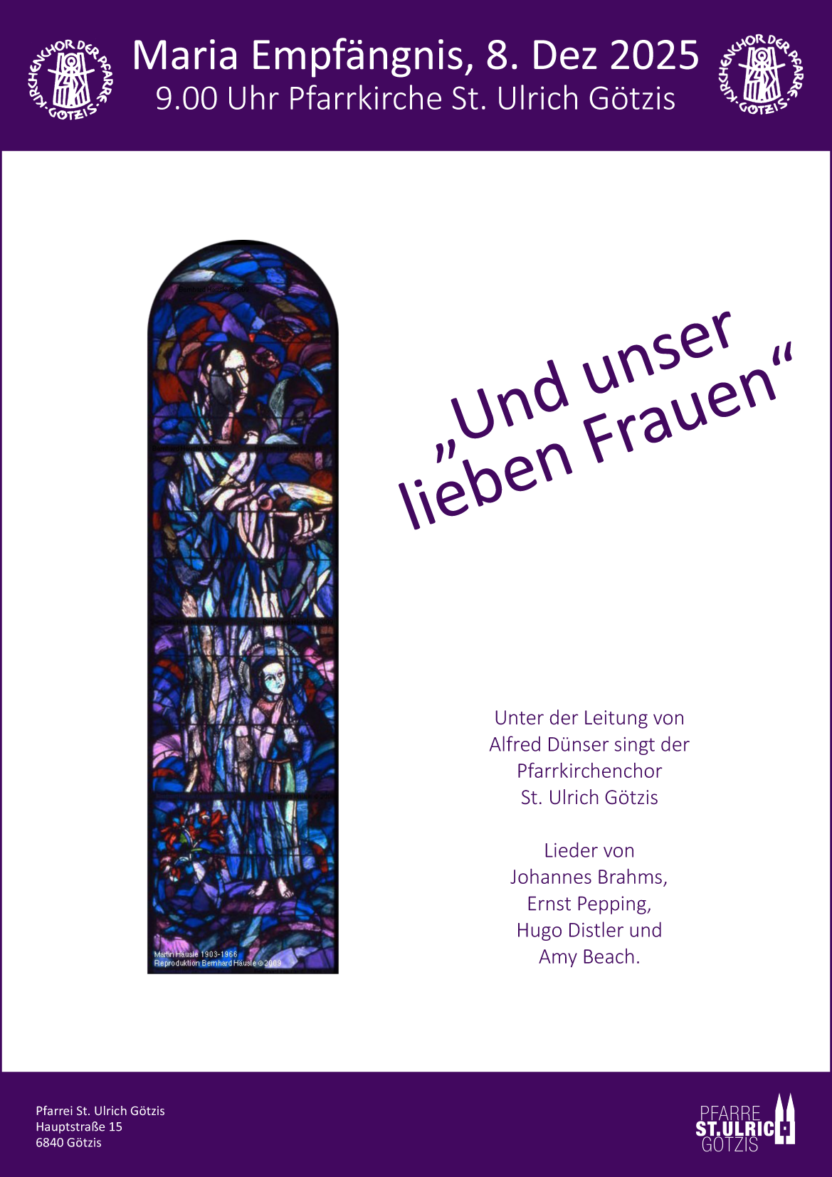 Unter der Leitung von Alfred Dünser singt der Pfarrkirchenchor St. Ulrich Götzis Lieder von Johannes Brahms, Ernst Pepping, Hugo Distler und Amy Beach.